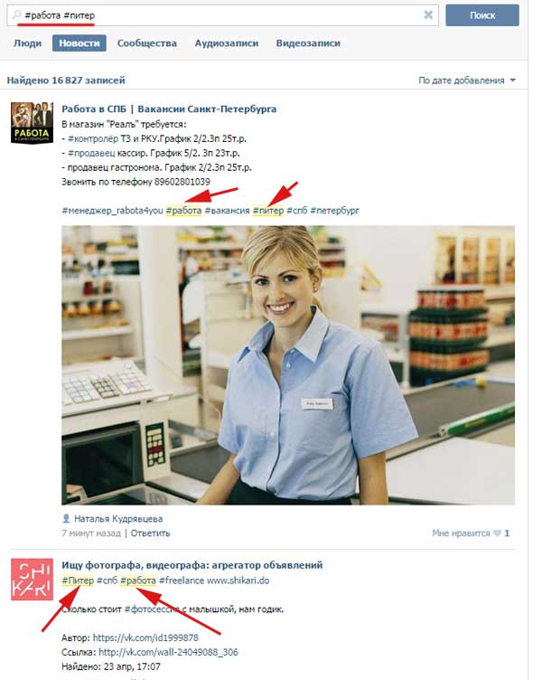 Точно так само можна здійснювати пошук і по декількох хэштегам. Наприклад, якщо мені захотілося пошукати роботу саме в Пітері, то я вбиваю запит, який складається з двох вже ключових слів через пробіл (#робота #пітер):