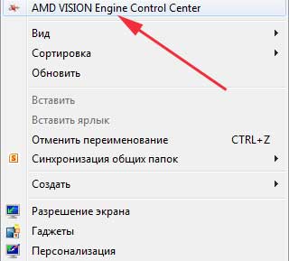 Зараз практично для кожної відеокарти разом з драйвером встановлюється певна програма управління. У мене, наприклад, це AMD VISION Engine Control Center. Запустити її можна або в панелі автозавантаження (яка знаходиться біля годинника) або знову ж клікнути правою кнопкою миші по робочому столу і з випавшого меню вибрати потрібний пункт. Я ще раз повторюся, що для різних відеокарт назва даних програм може бути різне: