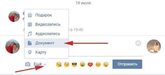 Знаходимо людину, якій хочемо відправити файл і починаємо писати йому повідомлення. Після того, як закінчите вводити текст можна вставляти файл. Для цього натисніть на кнопку «Ще» і з випав списку виберіть пункт «Документ»: