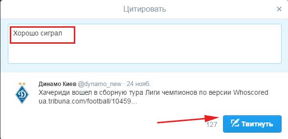 Щоб цитувати якийсь напишіть твіт у спеціальному полі свій коментар і натисніть на кнопку «Твітнуть»: