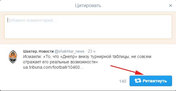 Якщо ви не хочете нічого цитувати і коментувати, а просто зробити ретвіт, то залиште це поле пустим і просто натисніть на кнопку «ретвітнути».