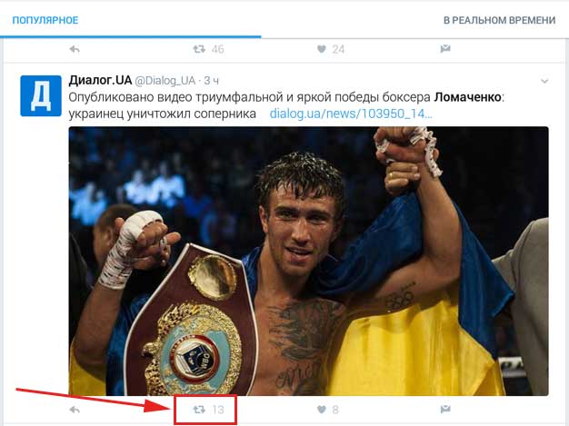 Точно також знаходимо запис, яку хочемо ретвітнути і натискаємо на вже знайому нам кнопочку: