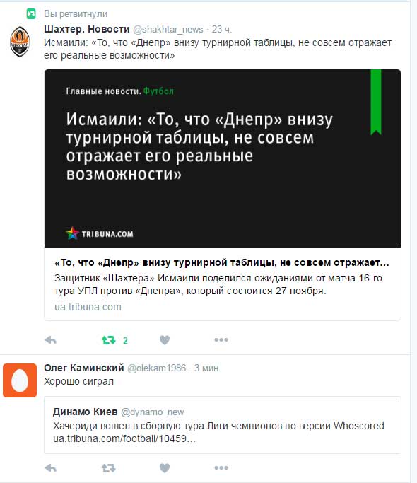 Дивимося на результат. Ретвіт з цитатою додався від нашого імені, а звичайний ретвіт від імені того чоловіка, який є автором: