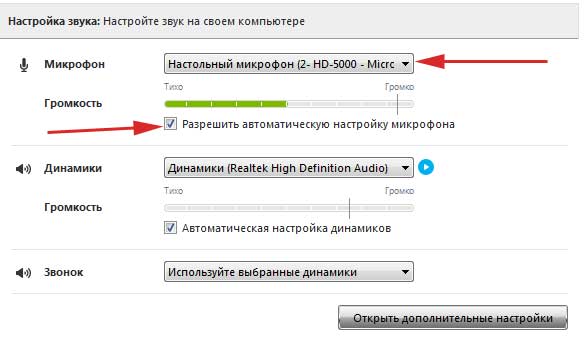 Тепер ми ставимо галочку навпроти пункту «Дозволити автоматичне налаштування мікрофону». А навпроти пункту «Мікрофон» ми і починаємо перебирати пристрою, поки не знайдемо той мікрофон, через який хочемо розмовляти по скайпу: