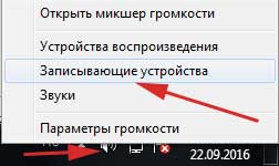 В операційній системі Windows можна регулювати гучність мікрофона, а вона може стояти на мінімумі або бути взагалі відключеній. Давайте подивимося, як виправити цю проблему. Натискаємо правою кнопкою миші по значку гучності біля годинника (операційна система Windows 7 в даному випадку) і з випавшого меню вибираємо пункт «Записуючі пристрої».