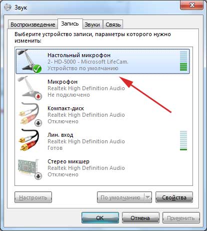 У віконці, необхідно перейти у вкладку «Запис», знаходимо там свій мікрофон. Перевіряємо, він повинен бути включеним і стояти, як мікрофон за замовчуванням, інакше саме з-за цього в скайпі він може і не працювати.