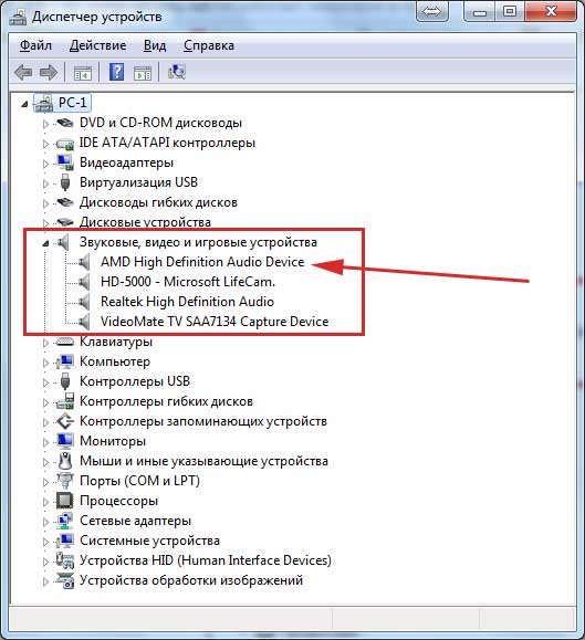Тепер дивимося, чи немає у вас невстановлених пристроїв в розділі «Звукові, відео та ігрові пристрої». Навпаки невстановленого пристрою зазвичай стоїть знак оклику.