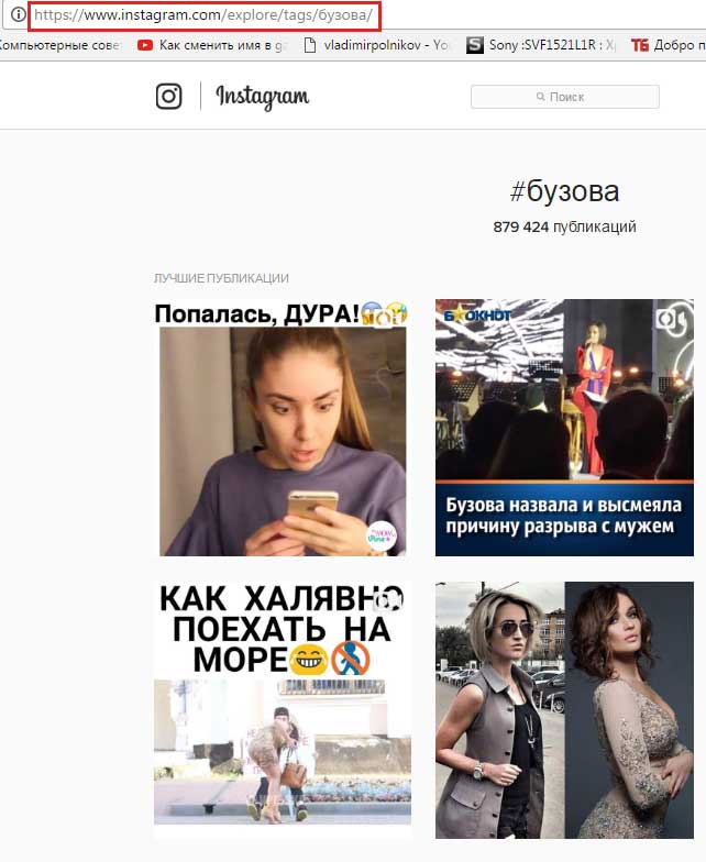Якщо не знаєте адресу сторінки, а людина знаменитий, то можна точно також пошукати його фотки, скориставшись тегами. Наприклад, для того, щоб знайти фотографії Бузової в Инстаграме, я в адресному рядку браузера ввів https://www.instagram.com/explore/tags/бузова/.