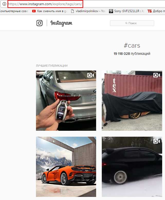 Наприклад, для того, щоб знайти фотографії з тематики «автомобілі» я використовував адреса https://www.instagram.com/explore/tags/cars/