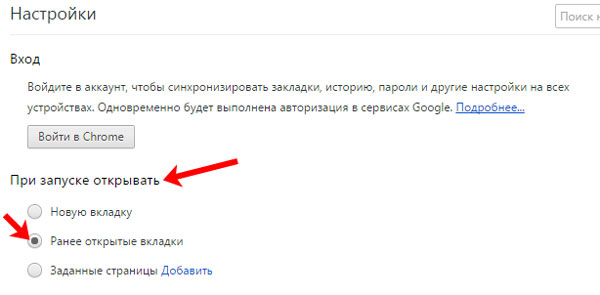 Шукаємо розділ «При запуску відкривати» і ставимо маркер в поле «Раніше відкриті вкладки». Після цього, можете закривати браузер, залишаючи при цьому відкритими потрібні вам вкладки. При наступному запуску Google Chrome, всі вони будуть запущені.
