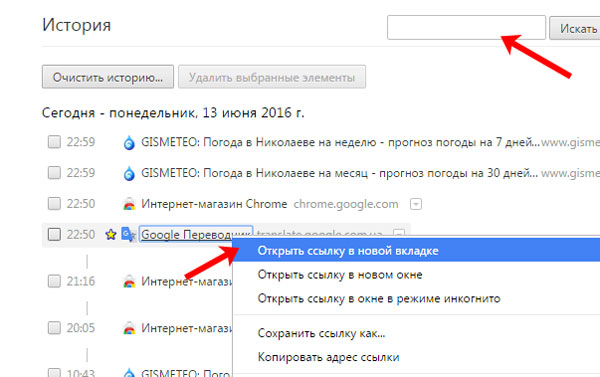 Всі переглянуті сторінки в браузері розсортовані по даті і часу. Але іноді, знайти потрібний буває не просто. Тому, можна скористатися рядком пошуку. Введіть в неї або назву сайту або його адресу, натисніть «Пошук».