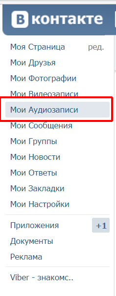 - Зайшовши на особистий аккаунт, переходимо в розділ з музичними треками, клацнувши мишею по посиланню «Мої аудіозаписи».