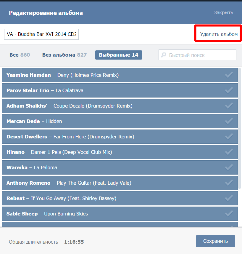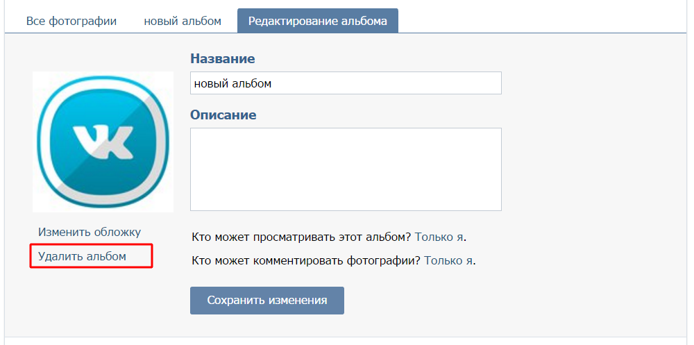 - Далі, під обкладинкою можна побачити посилання «Видалити альбом» (друга по рахунку). Натискаємо на неї.