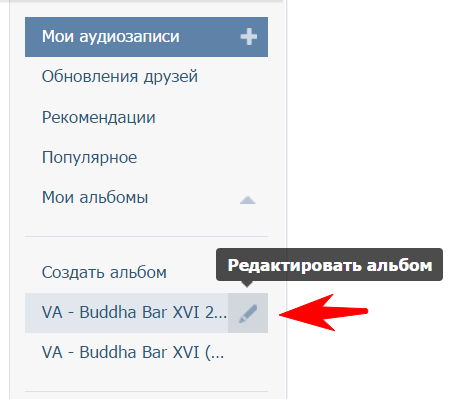 - Далі, випаде список, серед назв альбомів потрібно знайти той, який підлягає видаленню. Наводимо на нього курсор миші і праворуч бачимо маленький значок «олівець» (Редагування). Натискаємо на нього.