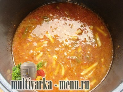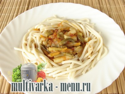 Заливаємо вміст чаші водою. Її кількість буде залежати від ваших уподобань. Захочете густу підливу, налийте менше води або навпаки більше для більш рідкою. Встановлюємо режим гасіння 40 хвилин. За цей час всі овочі, зокрема стручкова квасоля приготуються відмінно.