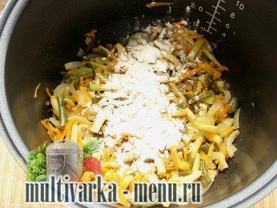 Додаємо борошно. Разом з нею продовжуємо обсмажувати овочі, перемішуючи їх лопаткою. Відключаємо режим.