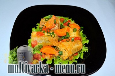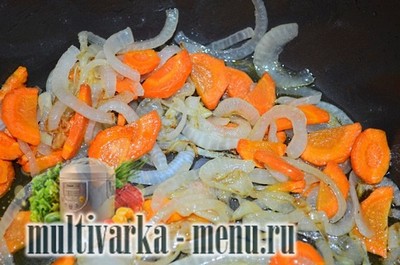 Олія соняшникова виливаємо в антипригарну чашу. Чистимо та миємо ріпчасту цибулю та моркву. Цибулю ріжемо півкільцями, а моркву кільцями і півкільцями. Порізані овочі викладаємо в ту ж чашу. Включаємо диво – каструлю і обсмажуємо овочі 3 хвилини до рум’яної скоринки. Помішуємо інгредієнти дерев’яною ложкою, яка не дряпає антипригарне покриття. На панелі управління натискаємо кнопку “Скасувати”.