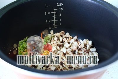 Гриби печериці нарізаємо кубиками невеликого розміру. Викладаємо в чашу мультиварки.