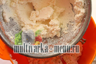 Щоб сирна запіканка в мультиварці вийшла надзвичайно ніжна і однорідна за консистенцією підготуємо сир. Його потрібно перетерти через сито або друшляк.