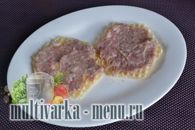 Хороший перемішаний фарш нам потрібно розподілити на вафельних коржах. Ви можете взяти спеціальні маленькі коржі, або кілька аркушів великих вафельних коржів. Потім великий корж, просто потрібно нарізати на шматочки бажаної величини.