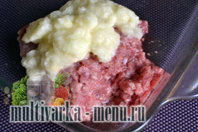 Відразу обмовимося, що фарш був заздалегідь зроблений з цілого шматка свинина. У ньому не було ніяких добавок. Можна фарш використовувати в такому вигляді. Ми ж пропонуємо додати у фарш, цибулю і картоплю, щоб він був більш соковитий і ніжний. Так і зробимо, подрібнити цибулю і картоплю через м’ясорубку або зануреним блендером. Додамо суміш до фаршу. Не забуваємо посолити і поперчити фарш.