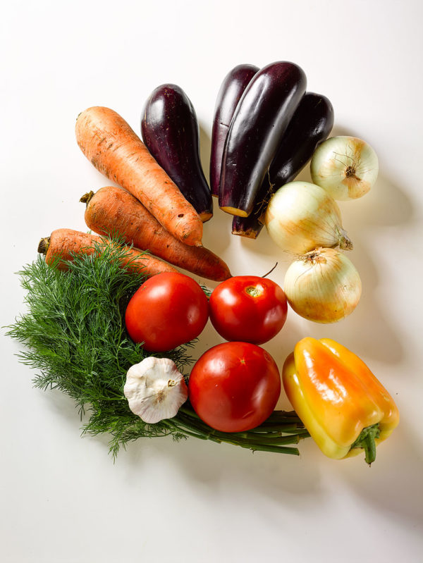 Так у приготуванні цієї страви використовується овочеве асорті, тому використовуємо правило: «Вага використовуваних баклажан повинен відповідати вазі інших овочів».