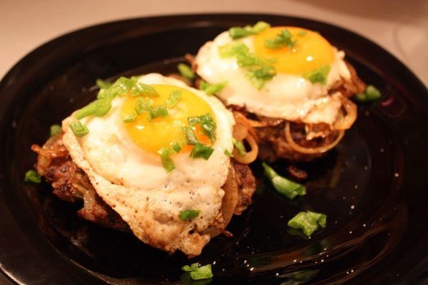 За хвилину до готовності посипте кожне яйце сиром. На біфштекс кладіть яйце і подавайте на стіл.