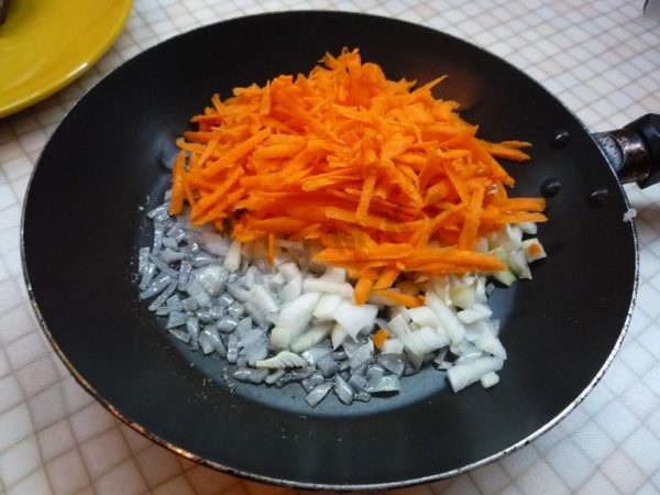 Попередньо можна обсмажити цибулю, моркву на сковороді з маслом. Спочатку близько 5 хвилин потрібно пасерувати цибулю, додати моркву, потім обсмажувати овочі до готовності 5 хвилин.