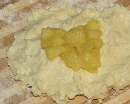 На дошку насипати трохи борошна. Ложкою набирайте тісто і формуйте кульки, а потім «коржі». В середину треба покласти начинку, і остаточно сформувати сирники.