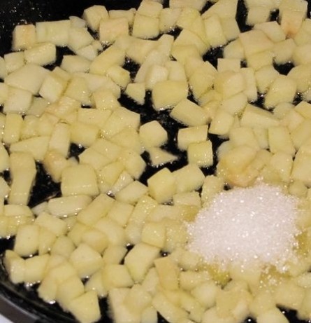 Починаємо з начинки. Яблуко очистити, нарізати кубиками, обсмажити на вершковому маслі, на фінішному етапі додати пів-ложки цукру. Дати охолонути.