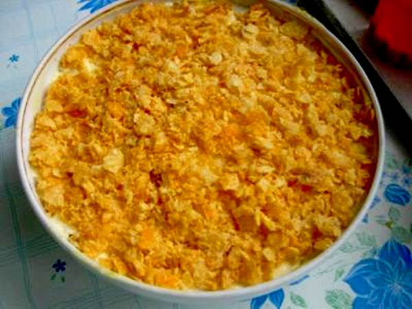 Приблизно 80% чіпсів необхідно поламати на дрібні шматочки і посипати ними салат.