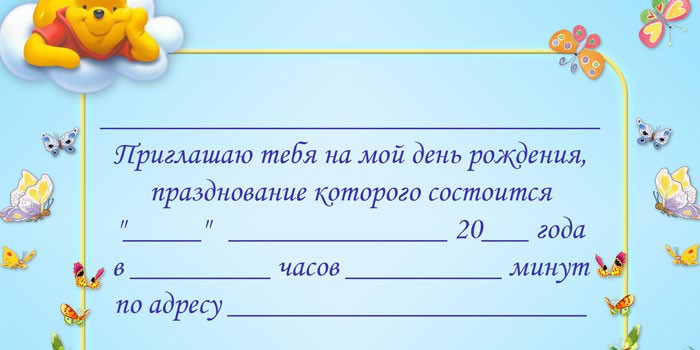 Запрошення на дитяче день народження можна створити з допомогою яскравих шаблонів, на яких зображено піратський корабель, герой смішного мультфільму або просто торт зі свічками. Краще всього вибирати формат разом з дитиною, а підлітку дозволити прийняти рішення самостійно, адже, ніхто інший не знає про те, що цікаво цьому поколінню (не варто забувати про комплекси, які можуть розвинутися у чоловічка, після вчинення необдуманого вчинку дорослим). Ось кілька прикладів шаблонів.