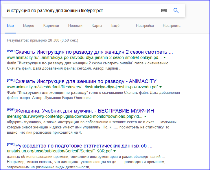 Наприклад: інструкція по розлученню для жінок filetype:pdf знайде вам реальну інструкцію, а не однойменний серіал.
