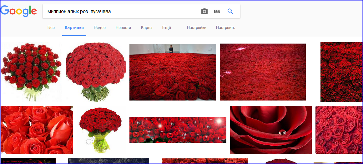 Наприклад,ви хочете знайти картинку з мільйоном червоних троянд, але Гугл наполегливо пропонує вам Пугачову. Наберіть «мільйон червоних троянд» -пугачова.