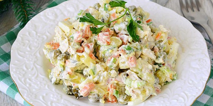 Деяким людям таке блюдо нагадує Олів’є. Салат з кольрабі з майонезом виходить смачним і ситним завдяки доданих компонентів: курячої грудки, зеленому горошку, маринованими огірочками, шинки, яйця. Можна зустріти фото подання такого ласощі в двох різних варіантах: в загальному салатнику і маленьких порційних. Обидва способи презентації підійдуть і виглядають дуже апетитно.
