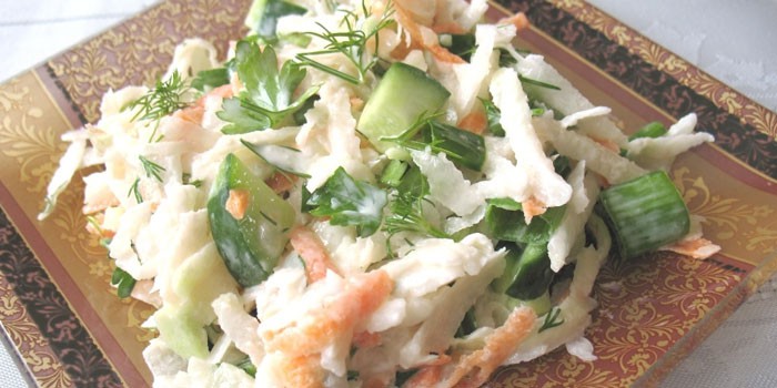 Блюдо, приготоване за рецептом, з яким ви незабаром познайомитеся дуже просто робити. Салат з кольрабі з майонезом і часником виходить дуже пікантним. Його можна урізноманітнити, додавши трохи обсмаженого бекону, але навіть в класичному виконанні закуска виходить дивовижною. Вона сподобається всім тим, хто любить страви швидкого приготування з досконалим смаком.