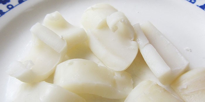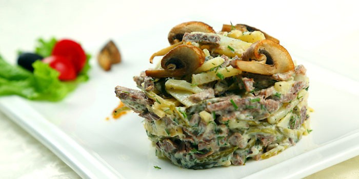 Перший варіант смачного, але простого страви – салат з маринованих печериць. Легка, ніжна закуска швидко готується, адже для неї буде потрібно зовсім невеликий набір продуктів. Консервовані гриби можна купити в магазині, однак якщо ви використовуєте власну домашню осінню заготівлю, смак тільки виграє.