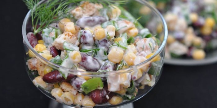 Ще один оригінальний варіант приготування ситної закуски салат з печерицями та кукурудзою в який також додають квасолю, сухарики, мариновані огірочки, часник, цибулю. Блюдо виходить яскравим, гоструватим, легким, але поживним, а для його приготування навіть не потрібен докладний покроковий рецепт з фото: всі компоненти продаються в консервах, їх потрібно тільки відкрити, відкинути на друшляк і змішати.