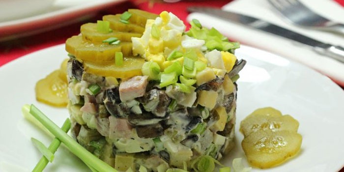 Проста, легка, але дуже поживна закуска відмінно підійде для обіду на роботі або сімейного вечері. Салат з печериць і шинки готується дуже швидко, але виходить вище всяких похвал. Потрібно буде придбати свіжі гриби, шинку середньої жирності і інші компоненти, зазначені у списку. Заправити частування можна нежирним майонезом або сметаною.