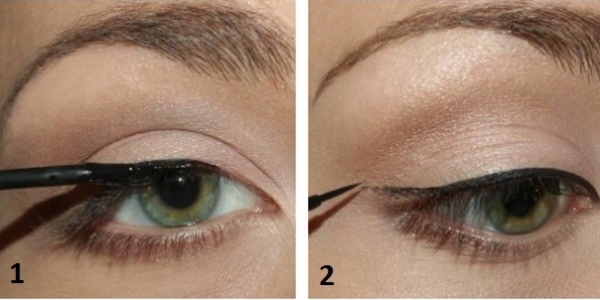 Є ще один спосіб. Він потрібен для створення широких стрілок. Напрямок руху аналогічно другий техніці малювання. Додаються додаткові кроки. Подивіться, на рисунку вони йдуть під цифрами 2 і 3. Спочатку верхня межа стрілки «замикається» на середині ока, Потім від середини ока на невеликій відстані проводять лінію до внутрішнього куточка.