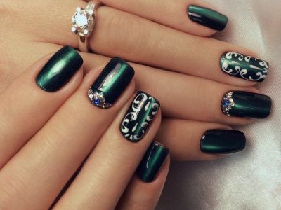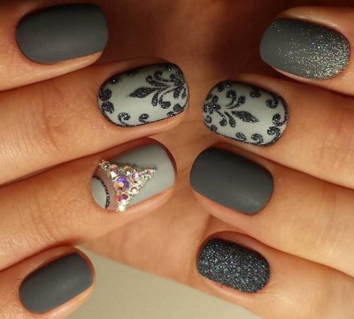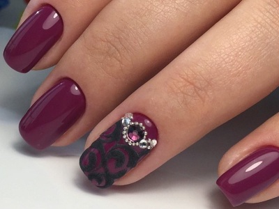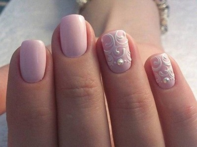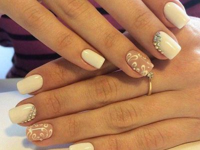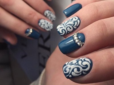 Вічні супутники вензелів як все елегантного і стильного. Камінчик може бути центром композиції, від якої розходяться завитки, а лунка, викладена стразинами, логічно доповниться елегантними вензелями. Єдине правило – ніяких кричущих тонів. Ніжна пастельна гама або насичена темна найкраще доповнюють блиск каменів і вишукану в’язь.