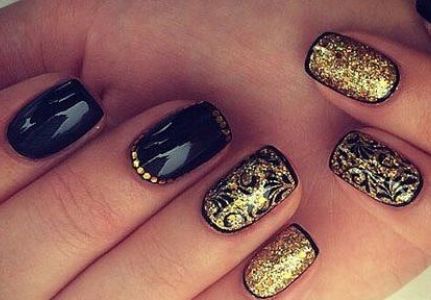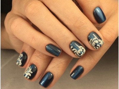 Коли намалюєте завитки, віялової пензлем посипте вензелі на нігтях блискітками і просушіть. Після жорсткої пензлем струсіть зайве. На глянці візерунок буде загадково мерехтіти. Це відмінний варіант для вечірнього манікюру або святкового. Його краще робити взимку, так як гармонія з ялинковими гірляндами, теплими в’язаними речами виходить вражаючою.