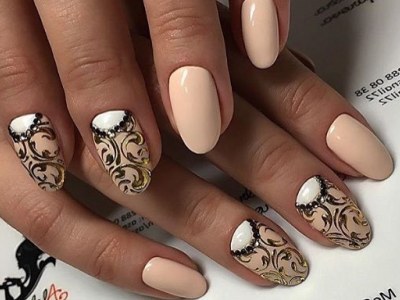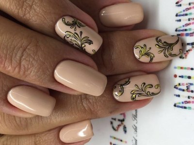 Королівські золоті узори виглядають відмінно на будь-якому тлі. Наприклад, бежевий лак оформить такий дизайн ніжніше і шляхетніше.