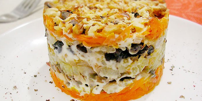 Легке, вітамінне, просте блюдо складається з доступних компонентів. Щоб приготувати салат, курка з чорносливом і грибами повинні попередньо пройти теплову обробку. Куряче філе можна замінити яловичиною або индюшиным м’ясом, а гриби використовувати не обсмажені, а мариновані або консервовані. Для гостроти іноді додають пару зубків часнику, а відварну моркву замінюють корейської, але це справа смаку.