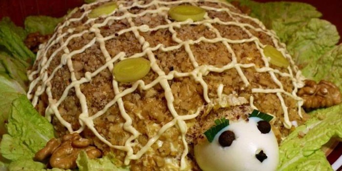 Відмінне блюдо до будь-якого свята, особливо дитячому! Крім вражаючого виду, салат Черепашка ще і дуже ситний, смачний. Курка чудово поєднується з грибами, сухофруктами, горіхами. Особливої уваги заслуговує спосіб оформлення страви вам знадобиться фантазія, трохи терпіння і деякі кулінарні навички. Фото готової закуски, опис того, як приготувати, можна без зусиль знайти в інтернеті.