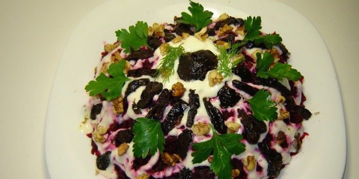 Знамените частування, яке часто з’являється на багатьох святкових столах. Прості компоненти відмінно поєднуються один з одним, але виконує соло в страві все ж копчена зливу. Закуску можна готувати у піст, якщо замінити майонез соняшниковою або оливковою олією. Салат з буряком та чорносливом легко урізноманітнити, якщо замість волоських горішків використовувати арахіс або кешью.
