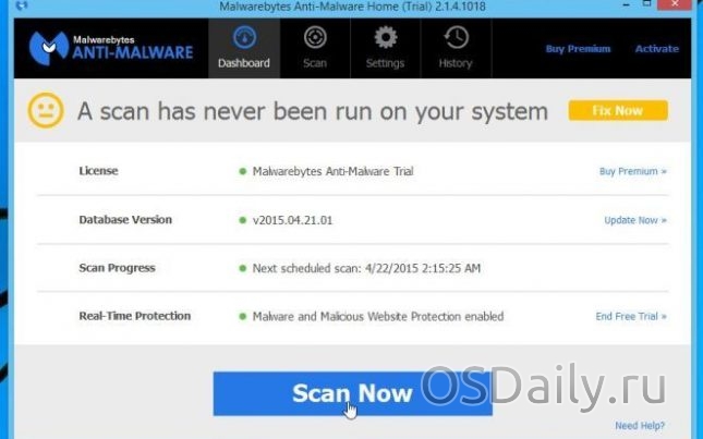 4. Після установки Malwarebytes Anti-Malware запуститься автоматично з’явиться повідомлення про необхідність оновлення програми і про те, що сканування системи до цих пір жодного разу не проводилося. Натисніть кнопку «Сканувати зараз».