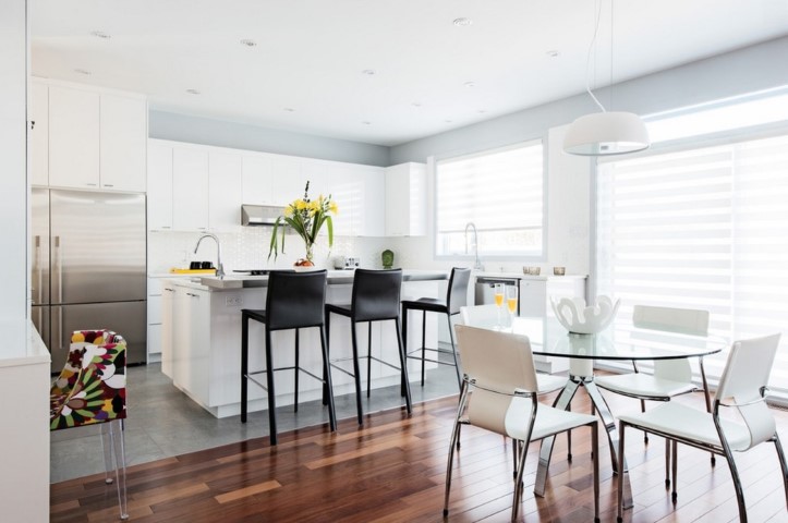 Іноді цікаво виглядають різноформатні стільці, це актуально для великих кухонь. Припустимо, барні близько відповідної стійки і звичайні – за обіднім столом. Тут головне дотримуватися єдиного стилю оформлення.