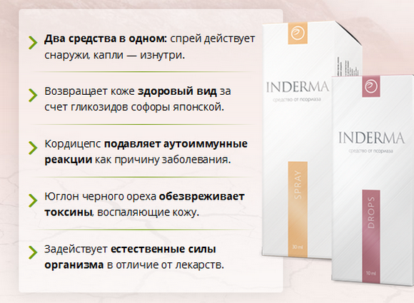 «Inderma» — це комплекс, що складається відразу з двох засобів. Спрей застосовується зовнішньо, впливає на прояви псоріазу та усуває їх. Краплі «Inderma» покликані впливати безпосередньо на причини розвитку захворювання і налаштувати організм на правильну роботу, нормалізацію протікають в ньому процесів і комплексне оздоровлення.