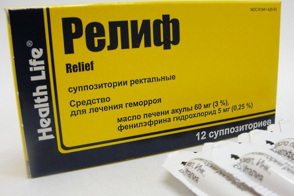 - «Реліф» містить масло печінки акули, а також фенілефрину гідрохлорид. Ці свічки проти геморою загоюють тріщини, усувають запалення, підвищують місцевий імунітет, а також звужують судини і тим самим знімають набряклість і зупиняють кровотечі. Вартість дорівнює приблизно 250 рублів.